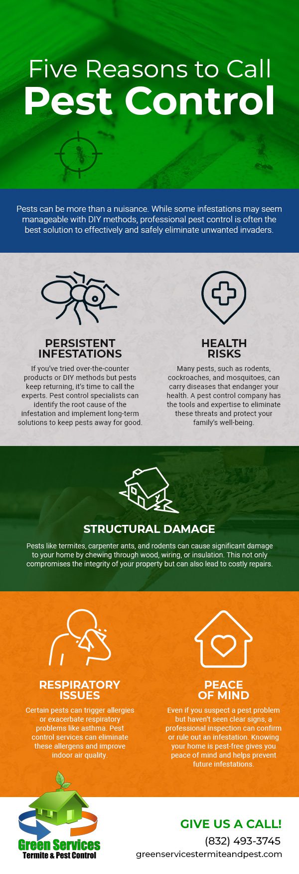 At Green Services Termite and Pest Control, we’re not only focused on ensuring your home and workspace are pest-free; we’re also dedicated to using safe and effective methods of pest and animal control so that you and everyone in the space are protected. As a family-owned company, we know there is a welcome peace of mind that comes from knowing your home and workspace are safe and sound. We have over 30 years of pest-control experience and use the latest tools, technology, and green products whenever possible to give you the results you need.